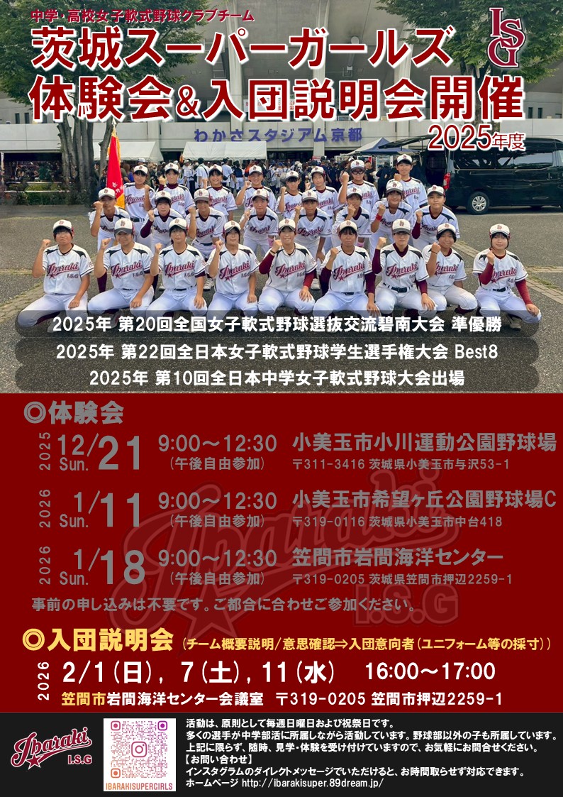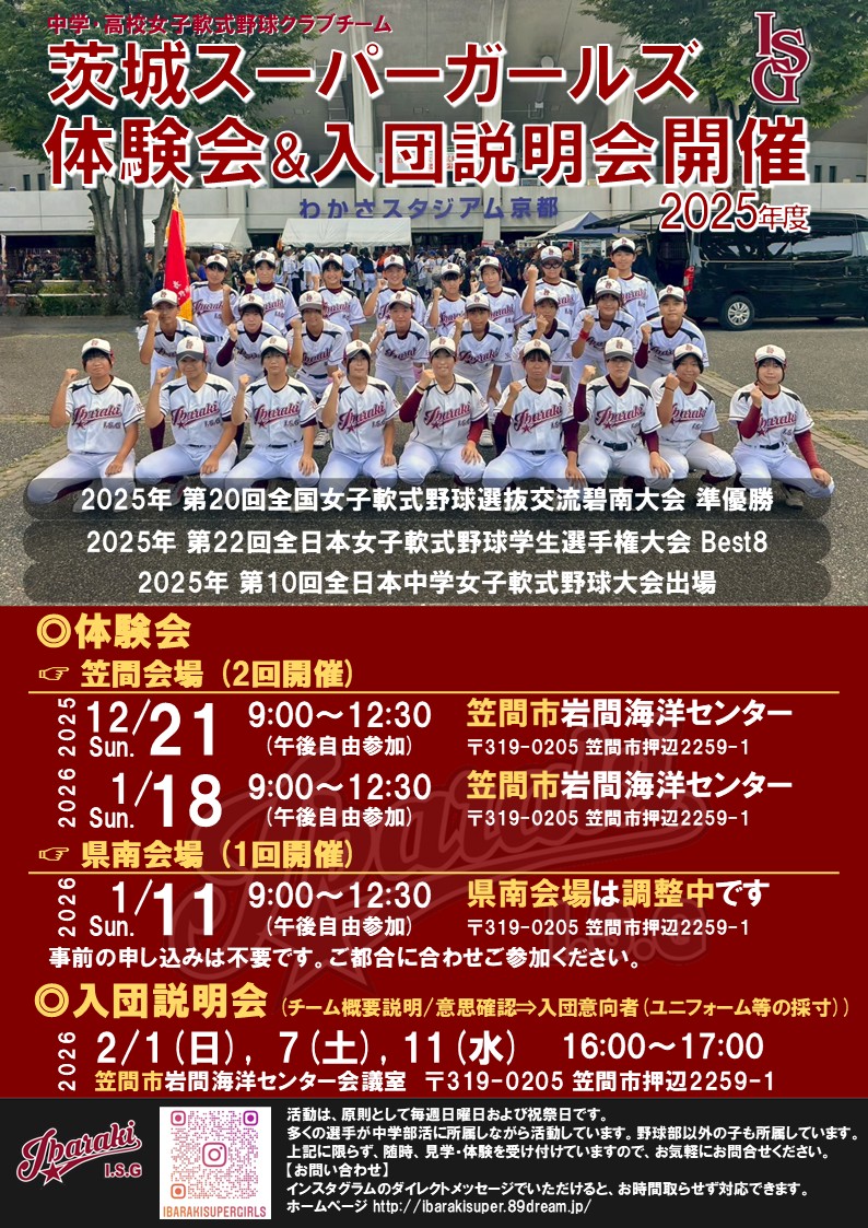 Ibaraki Super Girls (I.S.G)は、野球の大好きな女子たちが次のステージで活躍できるよう、令和元年(2019年)5月発足した、茨城県初、唯一の中学・高校女子軟式野球クラブチームです。さあ!いっしょに野球しませんか!